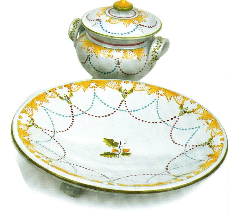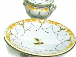 Le botteghe ceramiche faentine proposero queste tradizionali decorazioni tra la fine del ‘700 e l’inizio dell’800, sempre in servizi formati da molti pezzi.